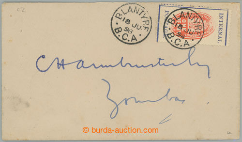 Philately. letter from Blantyre to Lomey, with local issue Coat of arms 1P with perf 12, SG.57, CDS BLANTYRE 18.JU.98, on reverse arrival postmark; very fine (Image) (Image2)