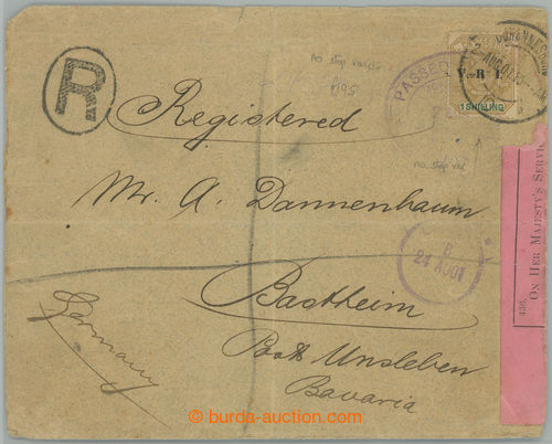 Philately. Reg letter Us by censorhip, from Johannesburg to Bavaria with exact franking 1Sh SG.233b, Coat of arms with printing error WITHOUT STOP AFTER R; fine letter, c.v.. £800 (Image) (Image2)