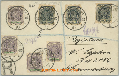 Philately. Reg letter from Johannesburg with high franking of stamps Coat of arms V.R.I. 3x 5Sh + 4x 2Sh6P, from that once 5Sh printing error WITHOUT STOP after V - SG.235a; fine letter, c.v. £305++ (Image) (Image2)