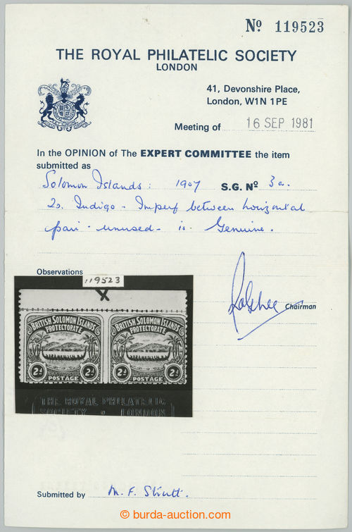 Philately. SG.3a, Rowing boat 2P indigo, marginal pair, in the middle with ommited vertical perforation; fine and scarce, certificate RPSL, c.v.. £15.000 (Image) (Image2)