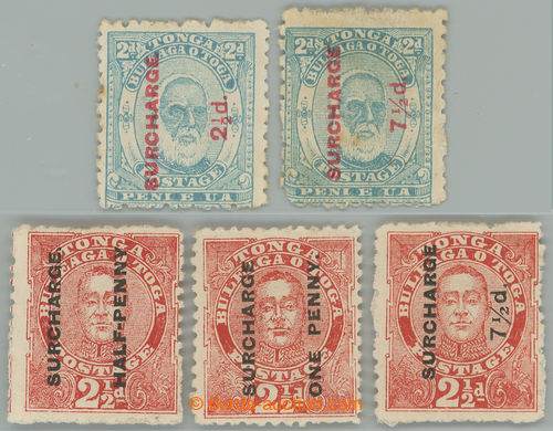 Philately. SG.27-31, George V. overprint 2½P on 2P blue, 7½P on 2P blue (some thins), HALF PENNY on/for 2½P red, ONE PENNY on/for 2½P red, 7½P on/for 2½P red; nice set, c.v.. £340 (Image) (Image2)