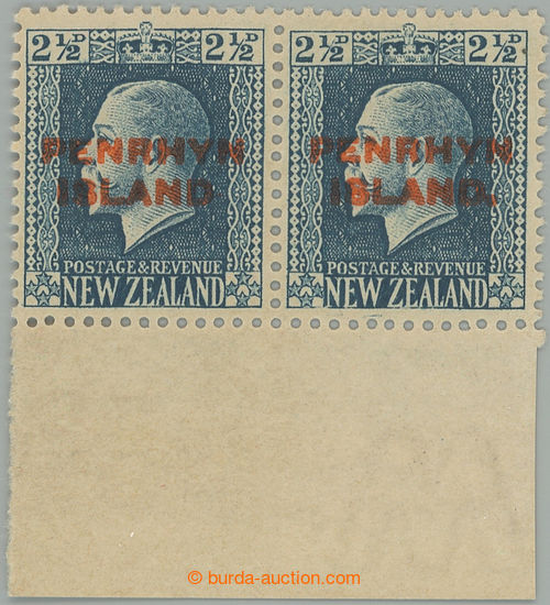 Philately. SG.24a+24ab, George V. 2½P of New Zealand with overprint PENRHYN ICELAND, the bottom marginal horizontal pair, left stamp printing error WITHOUT STOP after ISLAND; fine, right stamp minor gum fault, c.v.. £192, ex