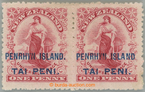 Philately. SG.10+10a, Allegory 1P with overprint PENRHYN ICELAND, perforation 14, horizontal pair, right stamp printing error WITHOUT STOP after ISLAND; fine, c.v.. £76 (Image) (Image2)