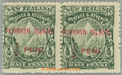 Philately. SG.9+9a, New Zealand Mount Cook (Aoraki) ½P with overprint PENRHYN ICELAND, perf 14, horizontal pair, left stamp printing error WITHOUT STOP after ICELAND; mint never hinged, c.v.. £230 (Image) (Image2)