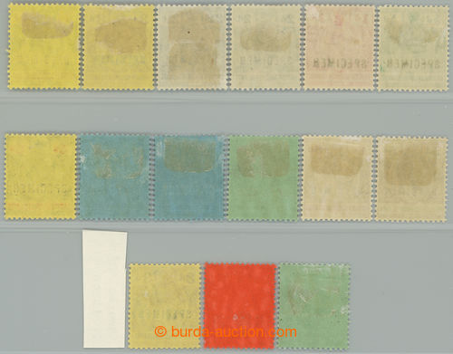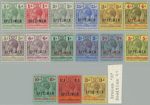 Philately. SG.22s-38s, George V. ½P - £1, complete set with overprint SPECIMEN, in addition value 3P with plate variety of overprint on pos. 41 - interrupted nib of M, the same with ½P and 1P; fine, c.v.. £425 (Image) (Image2)