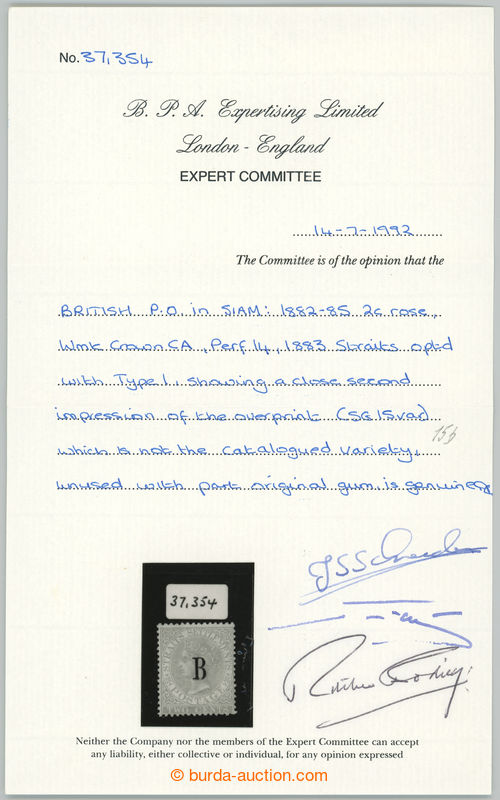 Philately. BRITISH POST OFF. - BANGKOK / SG.15b, Straits Settlements Victoria 2C pale rose with DOUBLE OVERPRINT B, wmk CA; fine, certificate BPA London, c.v.. £2.750, very rare stamp! (Image) (Image2)