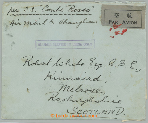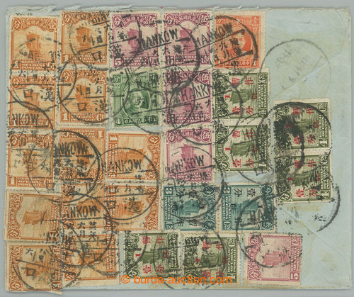 Philately. airmail letter from Hankow throughr Shanghai to Scotland, franked with mainly stamps issue 1925, total 27 (!), i.a. rare additional cancel. AIRMAIL SERVICE IN CHINA ONLY, airmail to Shanghai and then by ship S.S. Conte