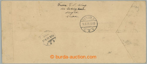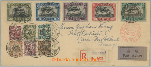 Philately. Reg and airmail letter sent from Shanghai to Germany, franked with. i.a. complete airmail issues Biplane 15c - 90c, Mi.223-227, Chinese cancel. and red cachet MIT LUFTPOST BEFORDET, on reverse CDS BERLIN 11.6.31 and JENA
