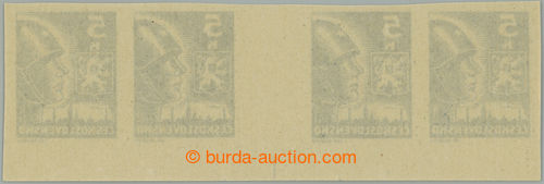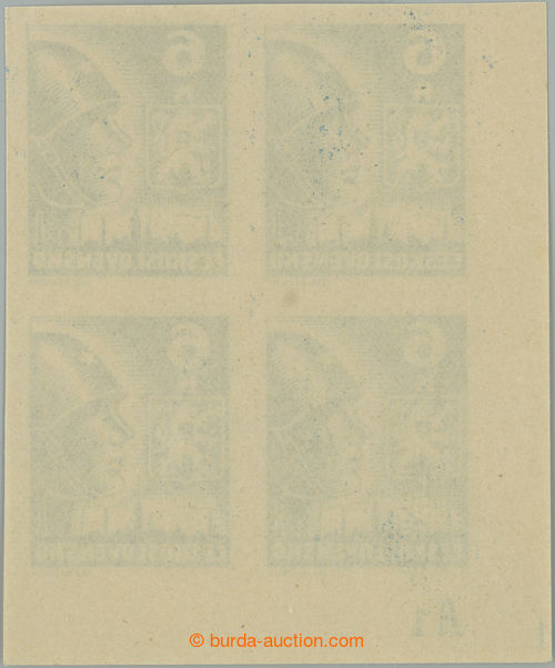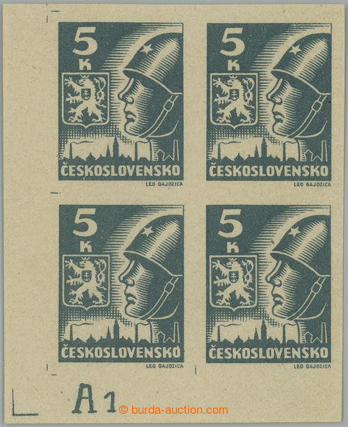 Philately. DESKOVE ZNACKY / Pof.355b plate mark, 5 Koruna light grey, LL corner blk-of-4 with plate mark A1; mint never hinged, nice significant shade light grey! (Image) (Image2)