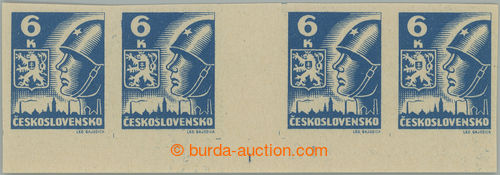 Philately. DESKOVE ZNACKY / Pof.356a (Mv) RE, 6 Koruna dark blue, 4-stamps. horiz. gutter with lower margin and retouch plate mark A1; mint never hinged (Image) (Image2)