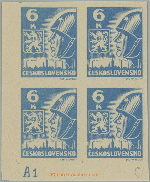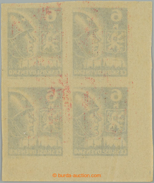 Philately. DESKOVE ZNACKY / Pof.356 plate mark, 6 Koruna blue, LL corner blk-of-4 with plate mark A1; mint never hinged (Image) (Image2)