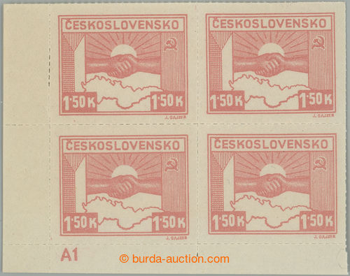 Philately. DESKOVE ZNACKY / Pof.353a plate mark, 1,50 Koruna light carmine, LL corner blk-of-4 with plate number A1, plate 1; mint never hinged, nice shade light and centered pin hole! (Image) (Image2)