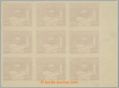 Philately. DESKOVE ZNACKY / Pof.353 plate mark, 1,50 Koruna carmine, LL corner blk-of-9 with plate number A1, plate 2; mint never hinged