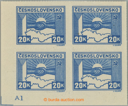 Philately. DESKOVE ZNACKY / Pof.359 plate mark, 20K blue, LL corner blk-of-4 with plate mark A1, plate 1 + plate variety pos. 110 - oblique white line above character K; mint never hinged (Image) (Image2)