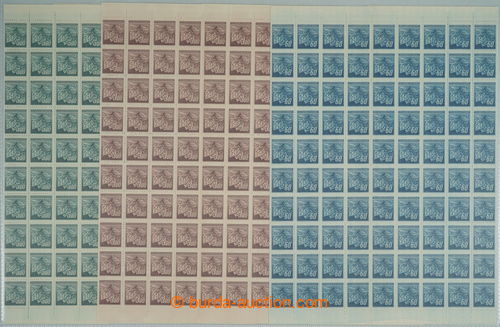 Philately. COUNTER SHEET / Pof.372-375, 376, 379, 380, Linden Leaves, comp. 7 pcs of complete 100 pcs of and 200 pcs of sheets, values 10h to 60h in/at hlubotisku sheets of 100, values 60h, 300h and 500h die-stamping in 200 pcs of