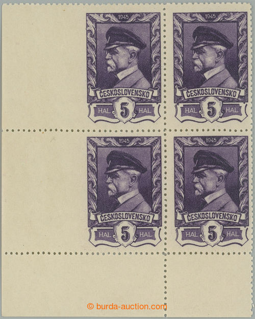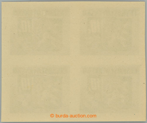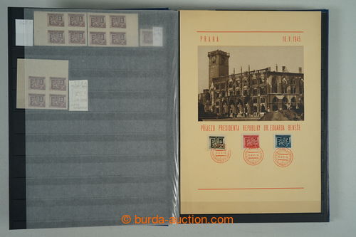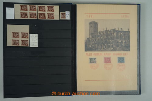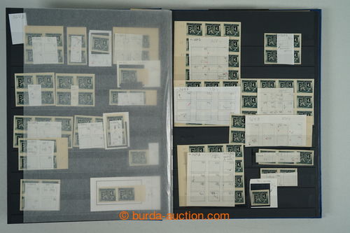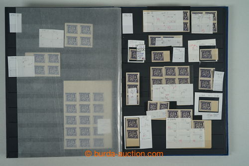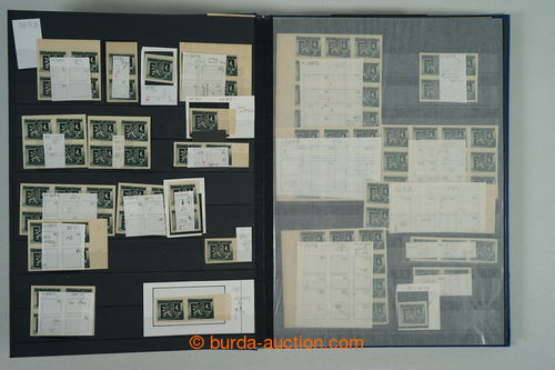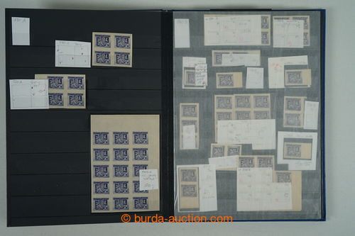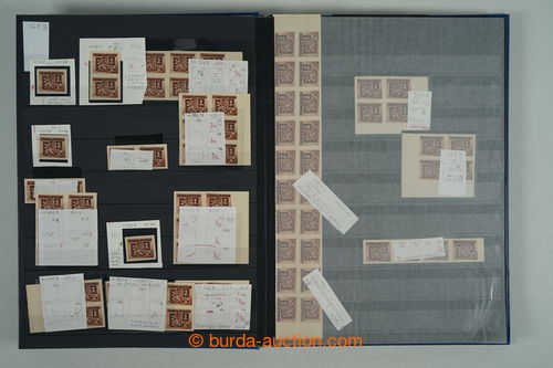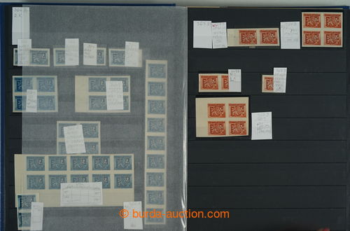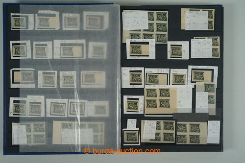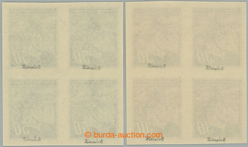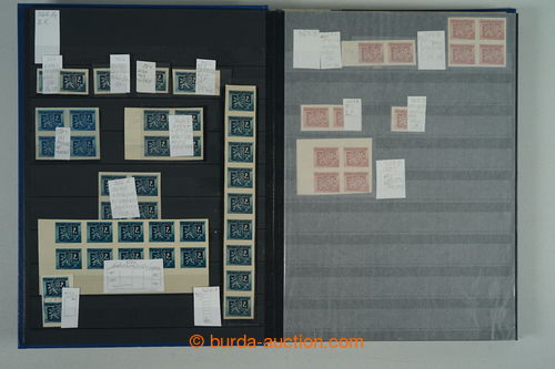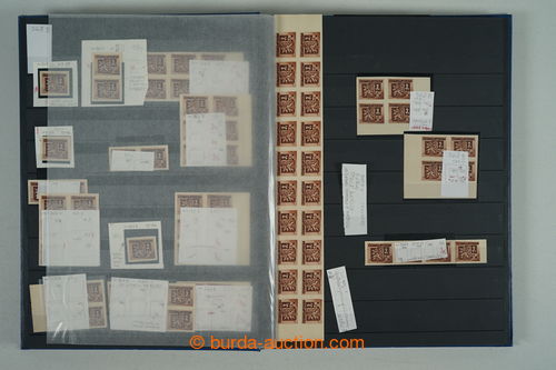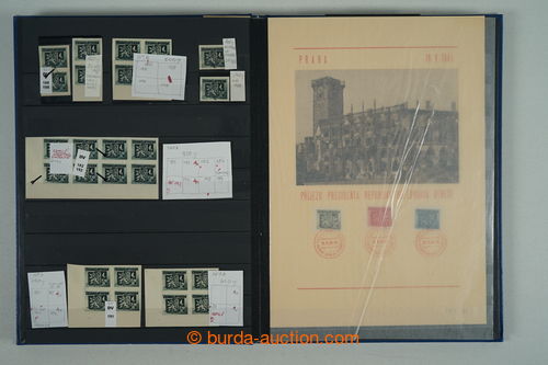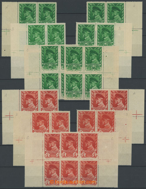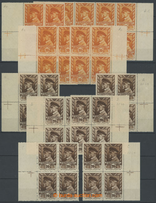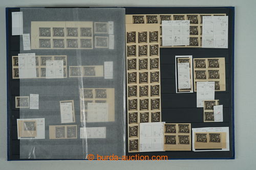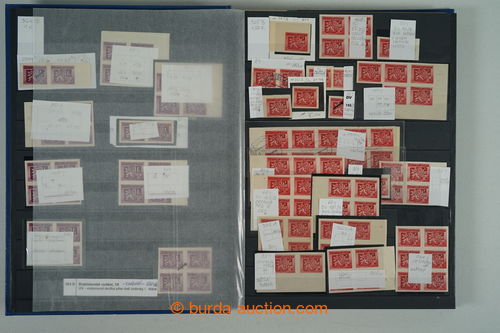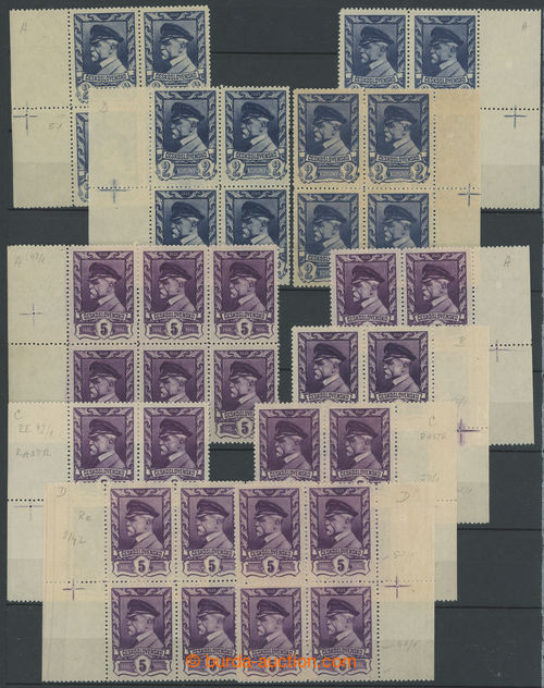 all 6 pcs of variants bloks of four, 1 Koruna - all 6 pcs of variants and value 2 Koruna - 4 pcs of bloks of four, all incl. intended plate variety and RE; mint never hinged, on 2 cards A4, all identified according to Graman - Koupal, c.v.. still