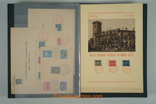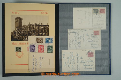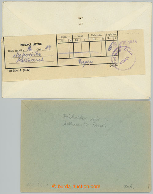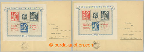 Philately. comp. 2 pcs of larger letters franked with. Kosice miniature sheet, several times circle in/at zelenosede color, CDS KOSICE 1/ 22.X.45 and arrival MLADA BOLESLAV 1/ 25.X.45, used on/for rub inverted blank form