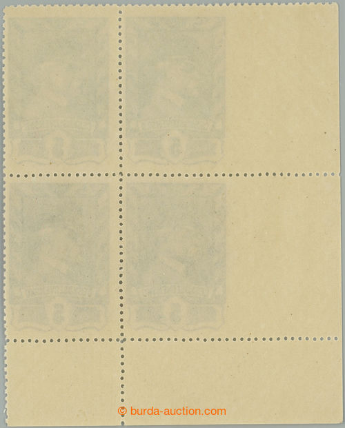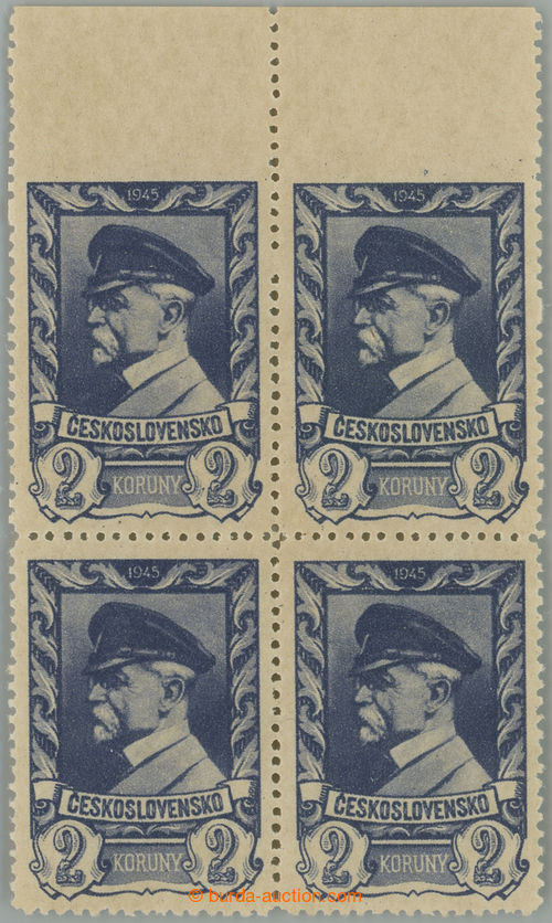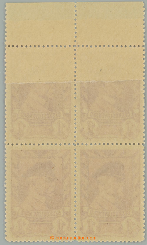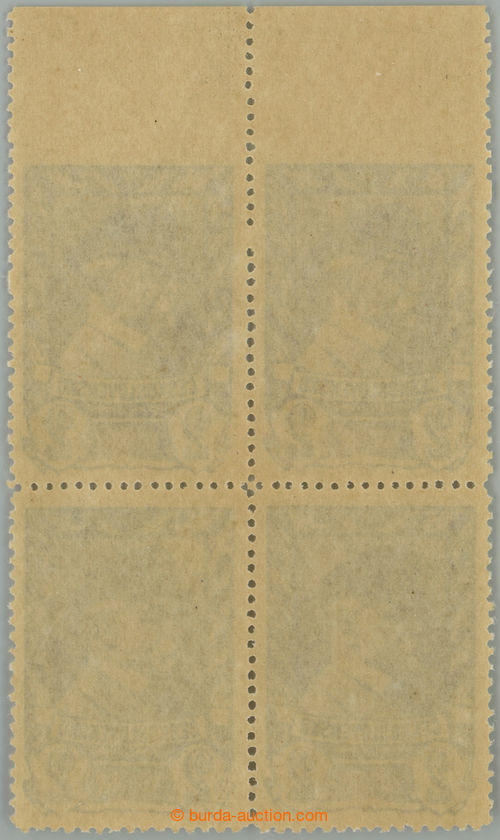 Philately. Pof.386 production flaw, Moscow 2 Koruna grey-blue, block of four with upper margin, production flaw - omitted upper horiz. perf + omitted perforation hole in/at middle vertical perf; mint never hinged (Image) (Image2)