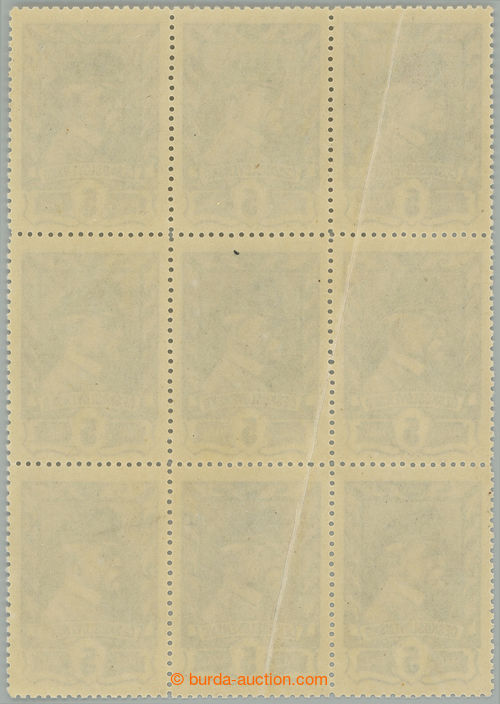 Philately. Pof.381 production flaw, Moscow 5h violet, blk-of-9 with significant oblique hair paper crease through/over 4 stamps; minor gum fault, decorative and rare (Image) (Image2)