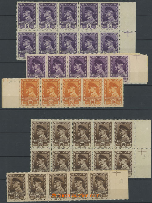 Philately. Pof.381-386, Moscow, selection of 38 pcs of bloks of four, multiblocks and stripe with SOUTISKOVYMI KRIZKY in margins from various plate, value 5h 9 pcs of - plate 1, 3, 4, value 10h - 5 pcs of, 20h - all 8 pcs of, 50h -