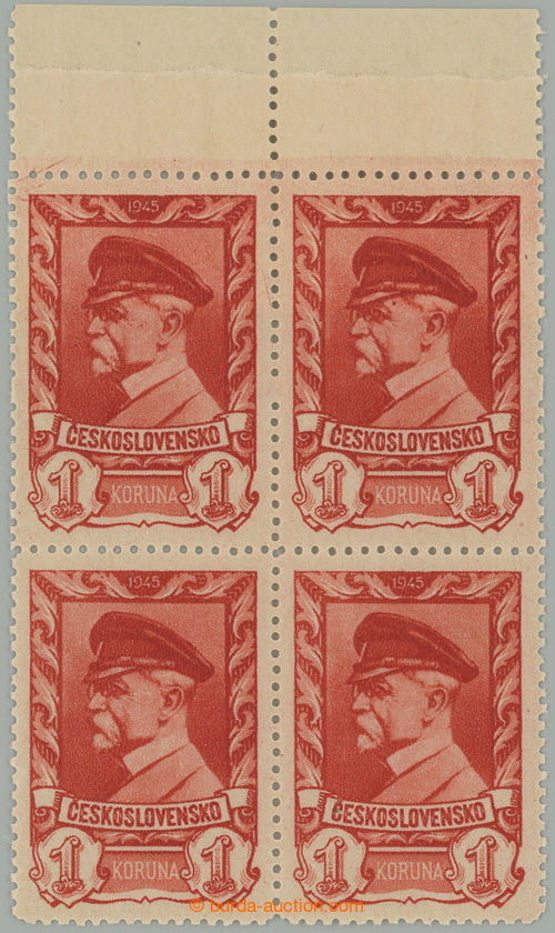 Philately. Pof.385 production flaw, Moscow 1 Koruna red, block of four with upper margin, NASTAVOVANY paper + omitted perforation hole; mint never hinged, very fine block, rare! (Image) (Image2)