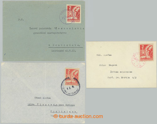 Philately. comp. 3 pcs of OBYCEJNYCH letters franked with. kosickou stamp. 2 Koruna red with provisory circular cancel. post offices MOLDAVA N. BODVOU (red), FILAKOVO (violet) and black cancel. DOBRA N. ONDAVOU; good condition (Image) (Image2)
