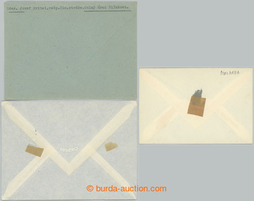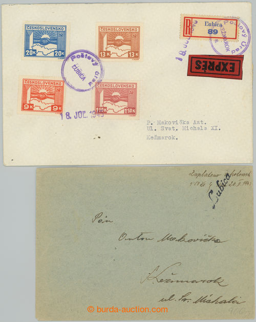 Philately. comp. of 2 letters with provisory cancel. LUBICA, 1x zaplaceny cash with line black cancel. LUBICA, 1x philatelically influenced Reg and Express letter with violet round cancel. POST URAD (off.)/ LUBICA, supplemented