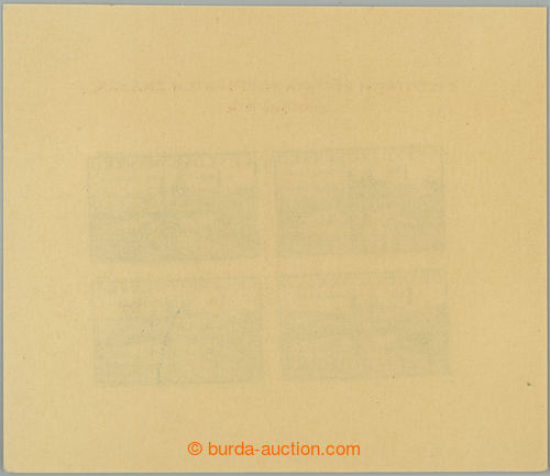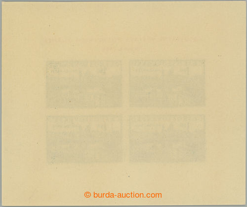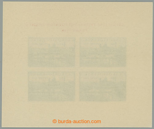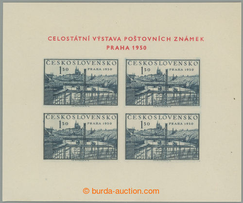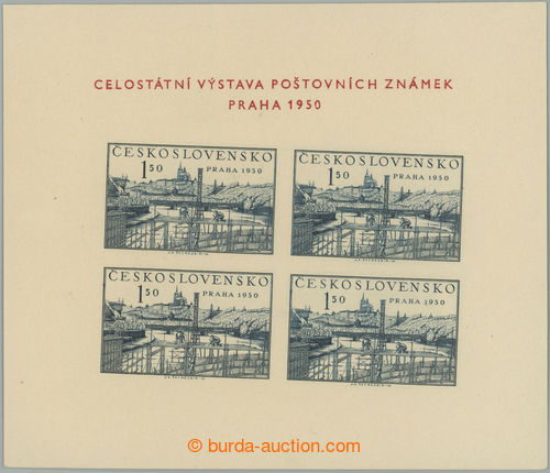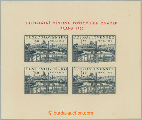 Philately. Pof.A564VV, miniature sheet PRAGUE 1950, significantly oblique print stamps against heading; small minor gum fault, otherwise mint never hinged, rare and decorative (Image) (Image2)