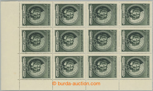 Philately. Pof.638 production flaw, International Week of Youth 2Kcs, LR corner blk-of-12, variously significantly to zelena zabarvena light hemisfera globu in background (nejvic on pos. 98 and 99), only on pos. 68 common white