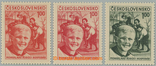 Philately. UNISSUED / PLATE PROOF refused design/sketch on stmp issue Mladez, Pioneer, our future hospodar, comp. 3 pcs of with value 1Kcs in/at orange, red and green color on stamp paper with gum; mint never hinged (Image) (Image2)