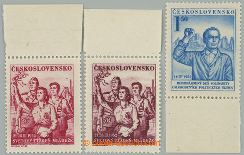 Philately. PLATE PROOF Pof.637, 644, International Week of Youth 1,50Kcs, 2 pcs of plate proofs in/at carmine and red-brown color with perf and with upper margin + PLATE PROOF stamp. Solidarity Day 1,50Kcs in/at light blue color