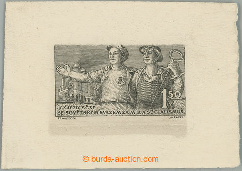 Philately. PLATE PROOF Pof.569, 2. congress SCSP 1,50Kcs, proof print unfinished gravure - without name state, in black color on white paper without gum, wide margins; without defects, exp. by Karasek (Image) (Image2)