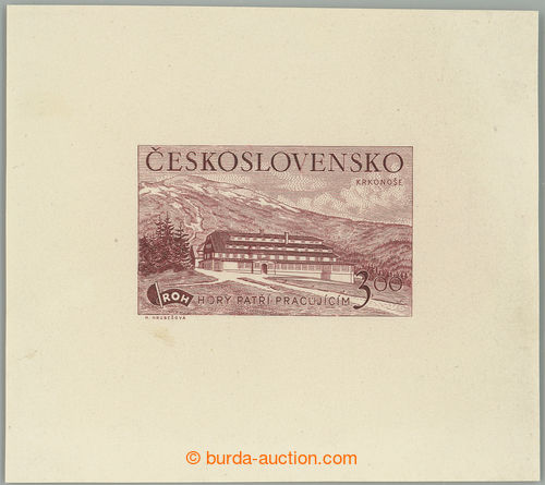 Philately. PLATE PROOF Pof.587, rekreace Labour Unions 3CZK, plate proof definitive gravure in/at original violet-red color on chalky paper without gum with wide margin; without defects (Image) (Image2)
