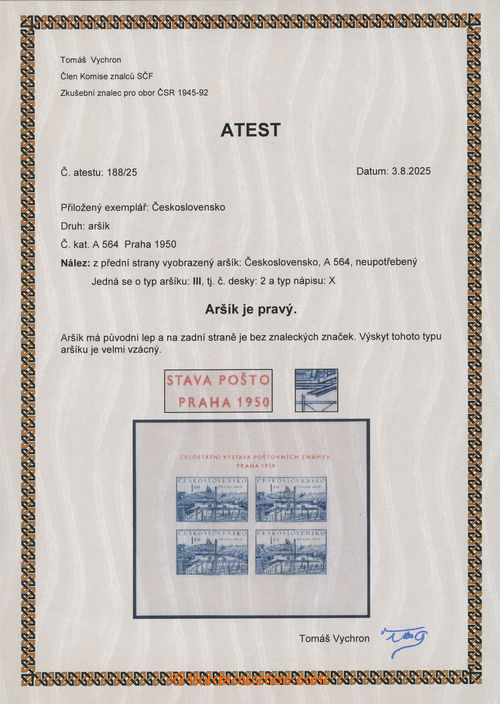 Philately. Pof.A564, miniature sheet PRAGUE 1950, sought type III (!), plate No. 2, type inscription X, combination B/30; very nice quality mint never hinged, small grain in paper in margin, certificate Vychron, quite rare, sought