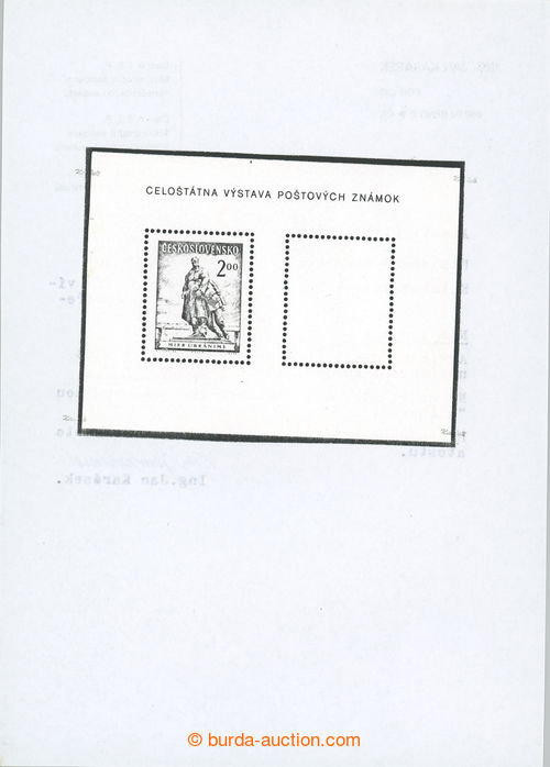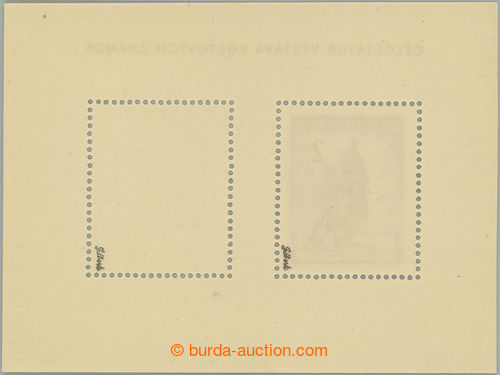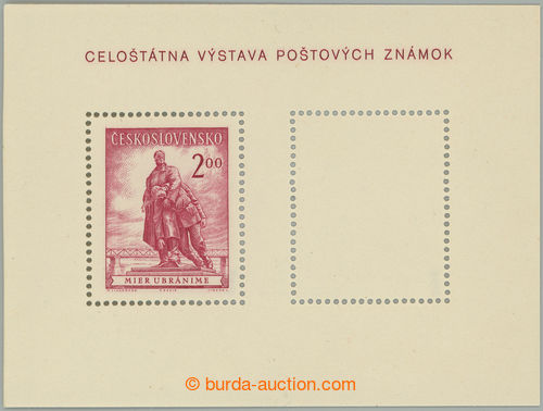Philately. Pof.A691/692 production flaw, miniature sheet BRATISLAVA 1952 with omitted print blue color, only with stamp. 2Kcs red (!); very nice quality without hints of labels and usual thin place, only small print fingers, exp.
