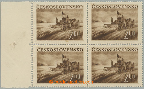 Philately. Pof.649 plate mark, Agriculture 2Kcs, block of four with L margin with registry cross; mint never hinged, small chip of wood in paper, c.v.. 2.500CZK, sought! (Image) (Image2)