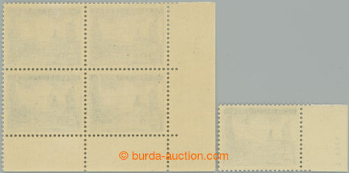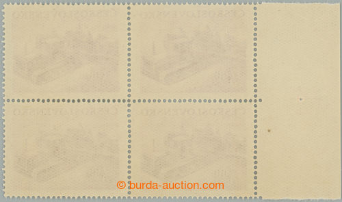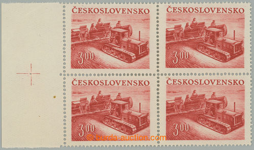 Philately. Pof.650 plate mark, Agriculture 3Kcs, block of four with L margin with registry cross; mint never hinged, small grain in paper margins, sought, rare usage esp. by/on/at the highest values 3Kcs!, c.v.. 2.500CZK (Image) (Image2)