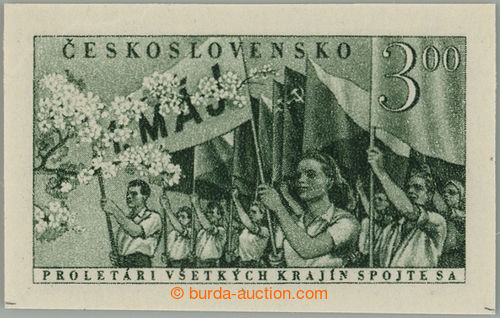 Philately. PLATE PROOF Pof.651, May Day 3Kcs, plate proof in/at green color on stamp paper with gum without perf; mint never hinged