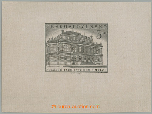 Philately. PLATE PROOF Pof.662, Prague Spring 3Kcs, proof print original gravure in/at grey-black color, on/for smooth paper with wide margin; without defects (Image) (Image2)