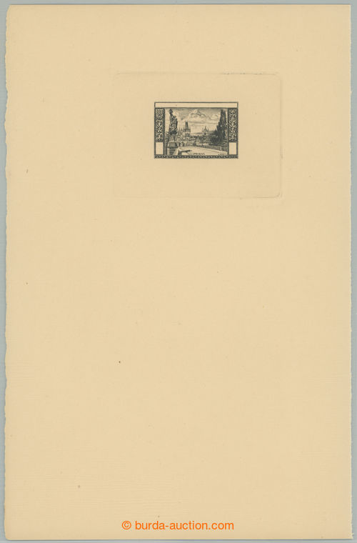 Philately. PLATE PROOF Pof.742, Prague - Charles Bridge, plate proof - print original gravure on yellowy paper in black color, whole sheet from important publication about part predniho engraver B. Heinz IN MEMORIAM BOHUMILA