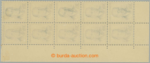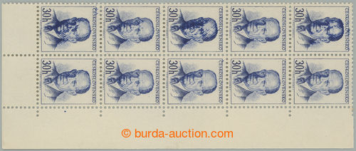 Philately. Pof.740A production flaw, Zapotocky 30h blue, LR vertical blk-of-10 with printing flaw - faulty ster color in/at the first column stamps, big stains color in face; label only on one stamp. at top and in margin, other