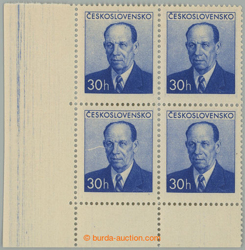 Philately. Pof.736 production flaw, Zapotocky 30h blue, LL corner blk-of-4 with significant printing flaw - white line before/(in front of) face on pos. 91 + vertical blue lines in L margin; mint never hinged, sought (Image) (Image2)