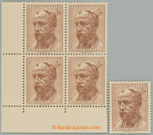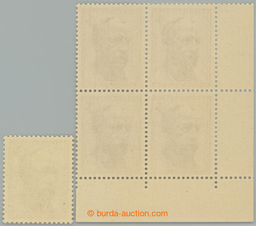 Philately. Pof.658 plate variety, Myslbek 1,50Kcs, 2x plate variety 42/1 - color stain below L in/at name state, 1x light brown in/at corner block of four (mint never hinged) and 1x stamp. darker brown (lightly hinged) - i. e.