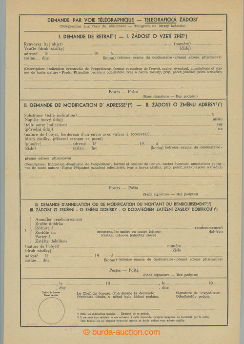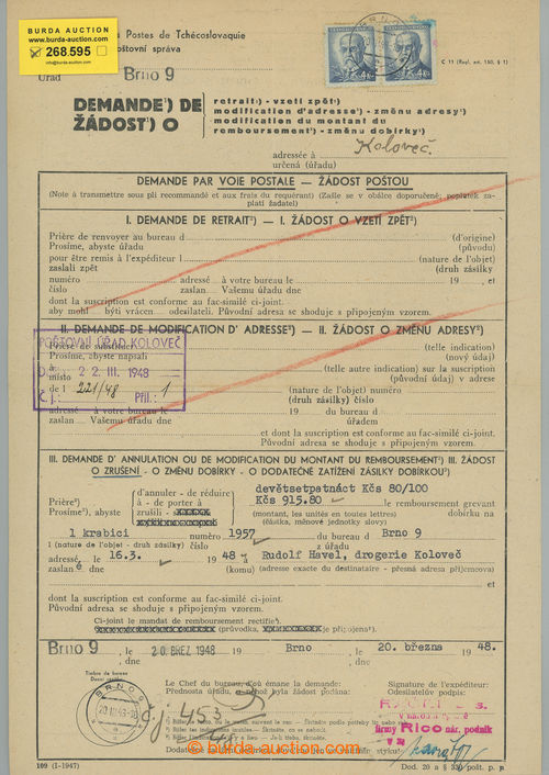 Philately. ZADOST O ZRUSENI DOBIRKY / used printed matter 109 (I-1947), fee paid 2 pcs of stamp. T. G. Masaryk 4CZK, Pof.423, CDS BRNO 9/ 20.III.48 and off. framed pmk post KOLOVEC 22.III.48; only fold and stamp. with zaspinenim
