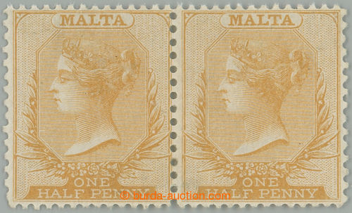 Philately. SG.16, Victoria ½P yellow-buff, wmk CC, better perforation 14 : 12½, horiz. pair; c.v.. £450 (Image) (Image2)