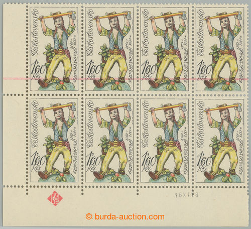 Philately. Pof.2354 production flaw, Slovak Pottery 1,60Kcs, L the bottom corner blk-of-8 with production flaw - red horiz. line through/over upper set all stamp., date of print 16.XI.78; interesting (Image) (Image2)