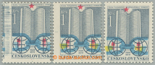 Philately. Pof.2357 production flaw, Anniv Comecon 1Kcs, comp. 3 pcs of with production flaw - 1x shifted perforation, colors and omitted yellow color with lines between stamp. + 2 pcs of with shift colors from that 1x in addition
