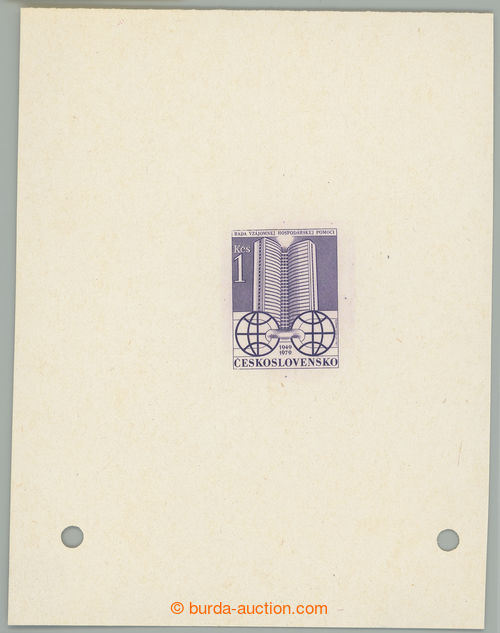 Philately. PLATE PROOF Pof.2357, Anniv Comecon 1Kcs, plate proof gravure in/at repaired violet color on/for stronger chalky paper without gum in/at miniature sheet arrangement with very wide margin and with filling holes in upper