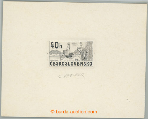 Philately. PLATE PROOF Pof.2394, Historical Bicycles 40h, proof master die in black color, on chalky paper without gum in/at miniature sheet arrangement with very wide margin, signed J. Hercik; without defects (Image) (Image2)