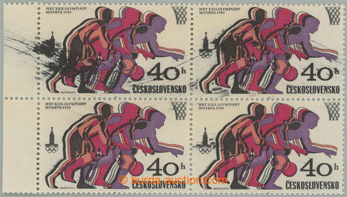 Philately. Pof.2418 production flaw, Summer Olympic Games Moscow 40h, block of four with L margin, production flaw - significant black vlnite lines and stains (defect scrap); mint never hinged (Image) (Image2)